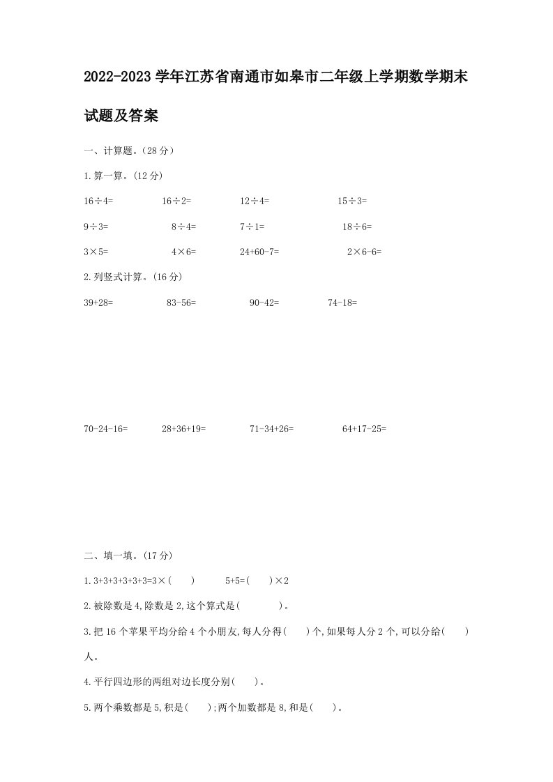 当前位置: 首页小学资源小学二年级正文 2022-2023学年江苏省南通市如皋市二年级上学期数学期末试题及答案(Word版)_共4页 小学二年级 2 周前 0 0 5 以上为部分内容预览,如需源文档请登录您的会员账号进行下载! 声明:本站所有文章,如无特殊说明或标注,均为本站原创发布。任何个人或组织,在未征得本站同意时,禁止复制、盗用、采集、发布本站内容到任何网站、书籍等各类媒体平台。如若本站内容侵犯了原著者的合法权益,可联系我们进行处理。 尚学资源永久会员 打赏 收藏 海报 链接