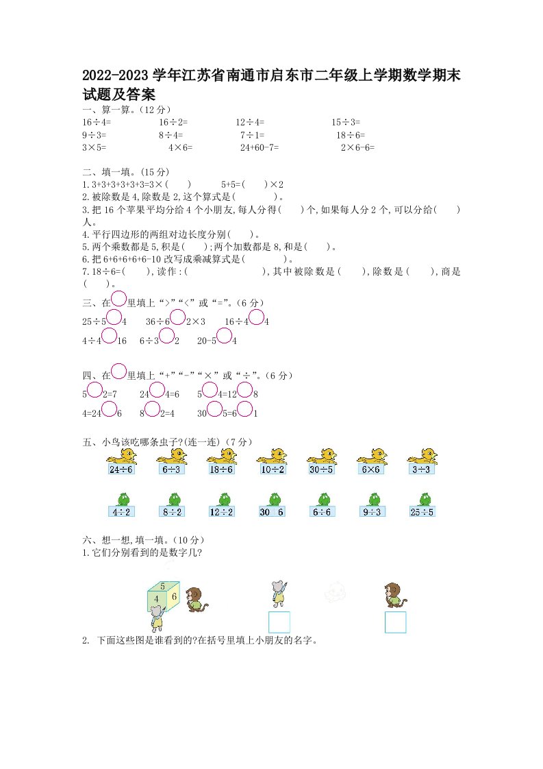 当前位置: 首页小学资源小学二年级正文 2022-2023学年江苏省南通市启东市二年级上学期数学期末试题及答案(Word版)_共5页 小学二年级 2 周前 0 0 5 以上为部分内容预览,如需源文档请登录您的会员账号进行下载! 声明:本站所有文章,如无特殊说明或标注,均为本站原创发布。任何个人或组织,在未征得本站同意时,禁止复制、盗用、采集、发布本站内容到任何网站、书籍等各类媒体平台。如若本站内容侵犯了原著者的合法权益,可联系我们进行处理。 尚学资源永久会员 打赏 收藏 海报 链接