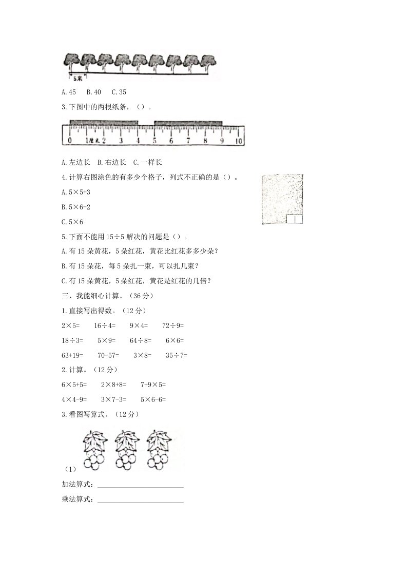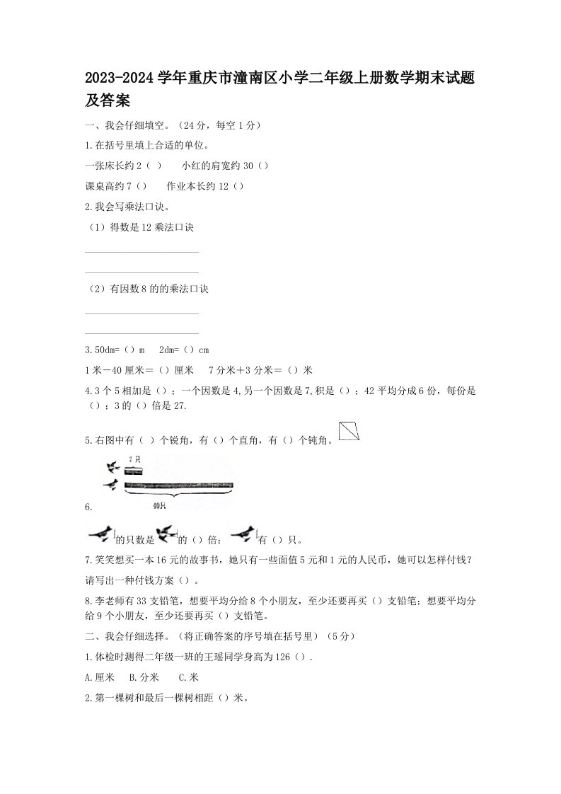 2023-2024学年重庆市潼南区小学二年级上册数学期末试题及答案(Word版)_共5页