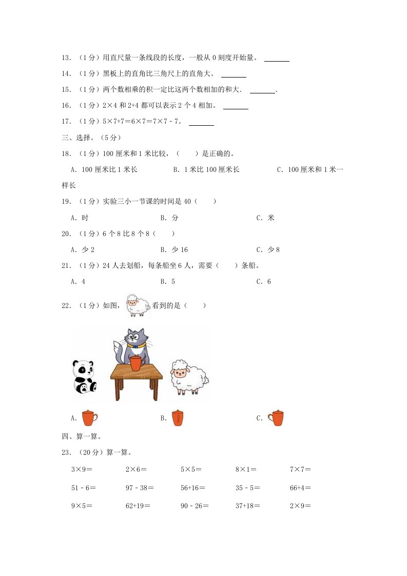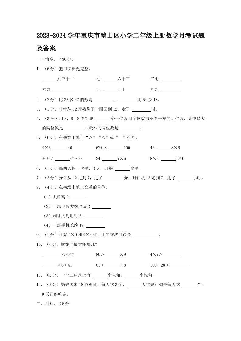 当前位置: 首页小学资源小学二年级正文 2023-2024学年重庆市璧山区小学二年级上册数学月考试题及答案(Word版)_共12页 小学二年级 2 周前 0 0 10 以上为部分内容预览,如需源文档请登录您的会员账号进行下载! 声明:本站所有文章,如无特殊说明或标注,均为本站原创发布。任何个人或组织,在未征得本站同意时,禁止复制、盗用、采集、发布本站内容到任何网站、书籍等各类媒体平台。如若本站内容侵犯了原著者的合法权益,可联系我们进行处理。 尚学资源永久会员 打赏 收藏 海报 链接