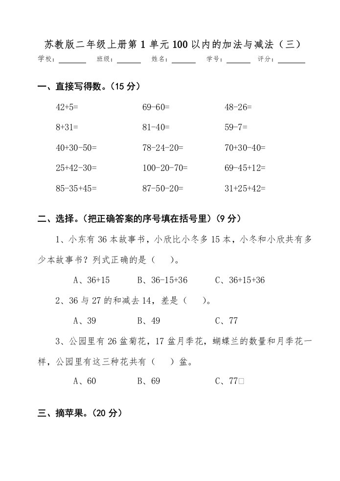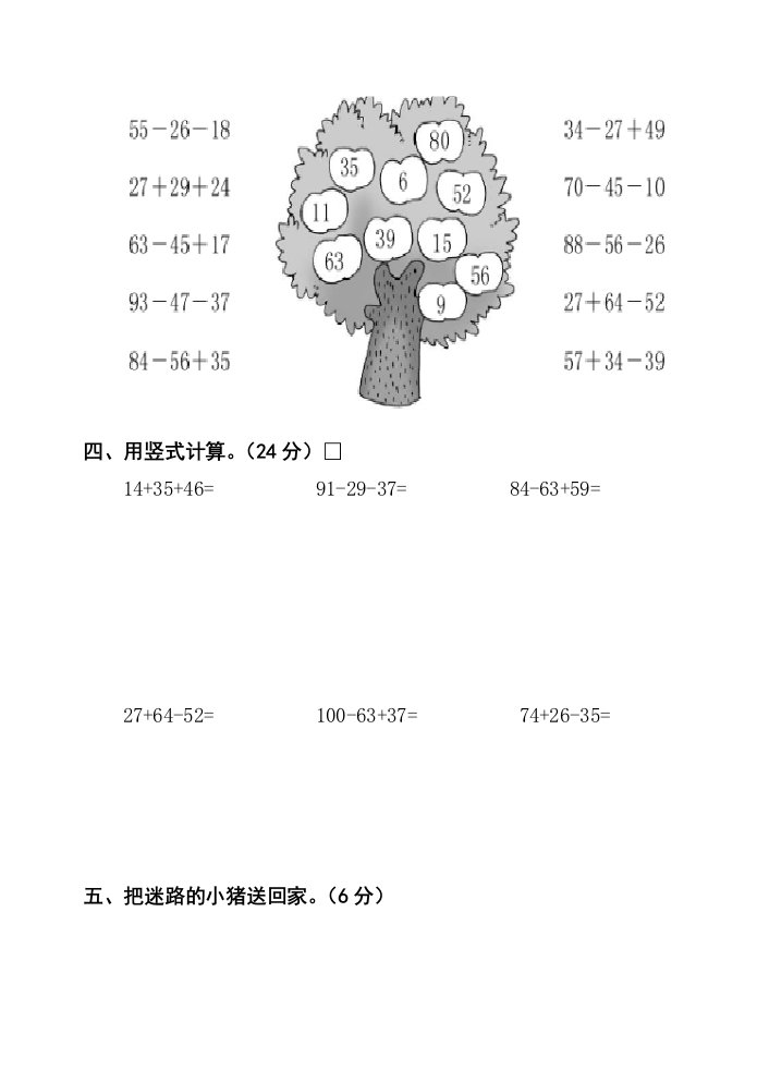 二年级数学上册册第1单元100以内的加法与减法(三)测试卷(苏教版)_共4页