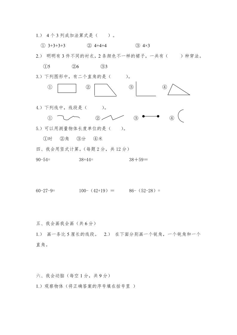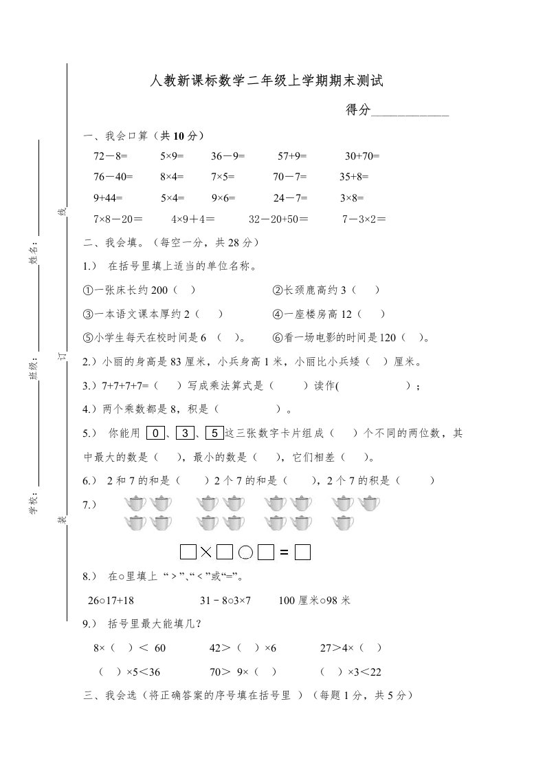 二年级数学上册期末测试卷1(人教版)_共6页