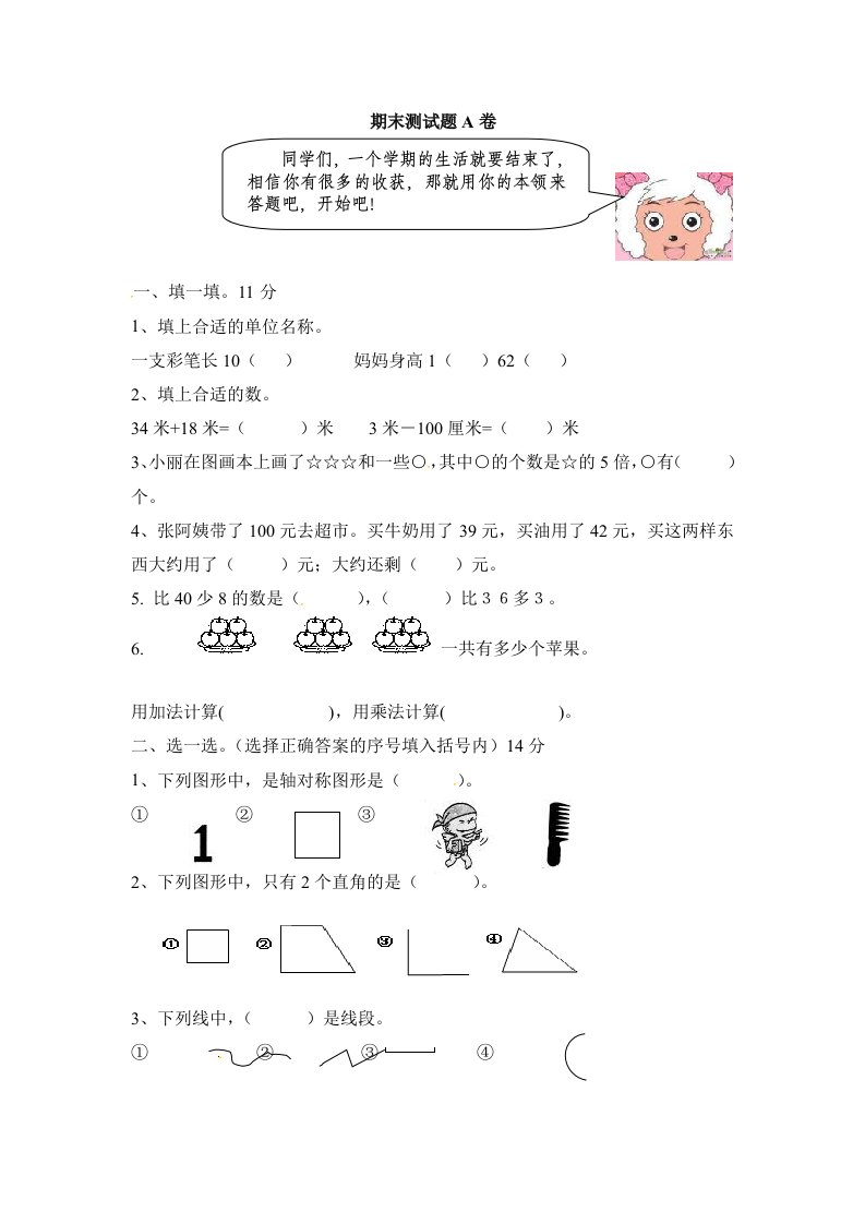 当前位置: 首页小学资源小学二年级正文 二年级数学上册期末测试卷2(人教版)_共6页 小学二年级 2 周前 0 0 5 以上为部分内容预览,如需源文档请登录您的会员账号进行下载! 声明:本站所有文章,如无特殊说明或标注,均为本站原创发布。任何个人或组织,在未征得本站同意时,禁止复制、盗用、采集、发布本站内容到任何网站、书籍等各类媒体平台。如若本站内容侵犯了原著者的合法权益,可联系我们进行处理。 尚学资源永久会员 打赏 收藏 海报 链接