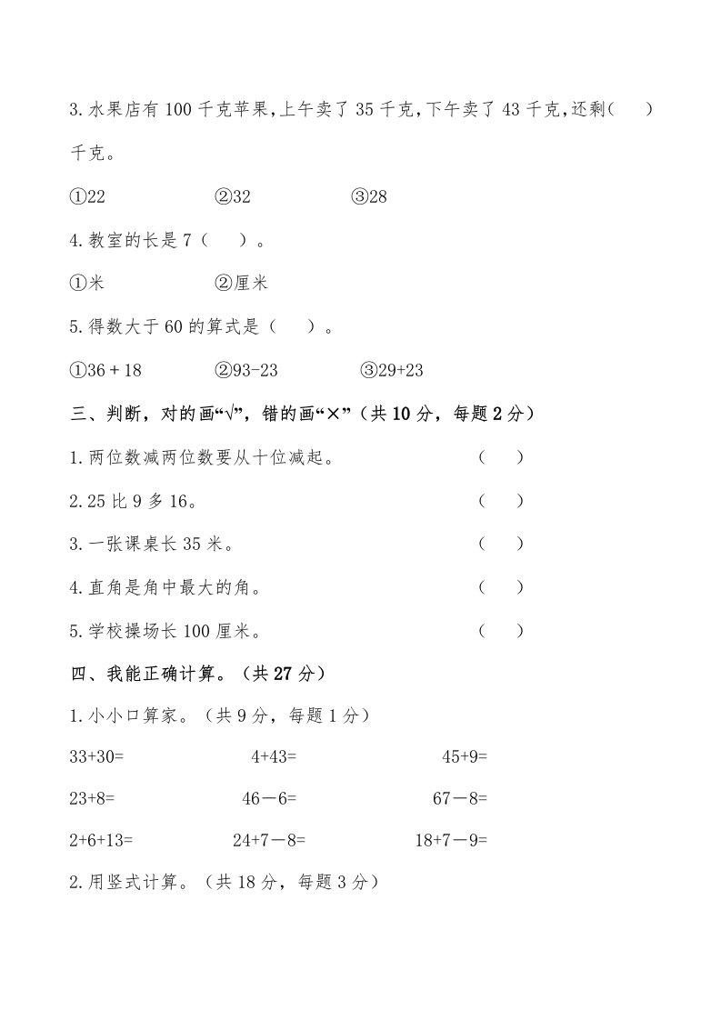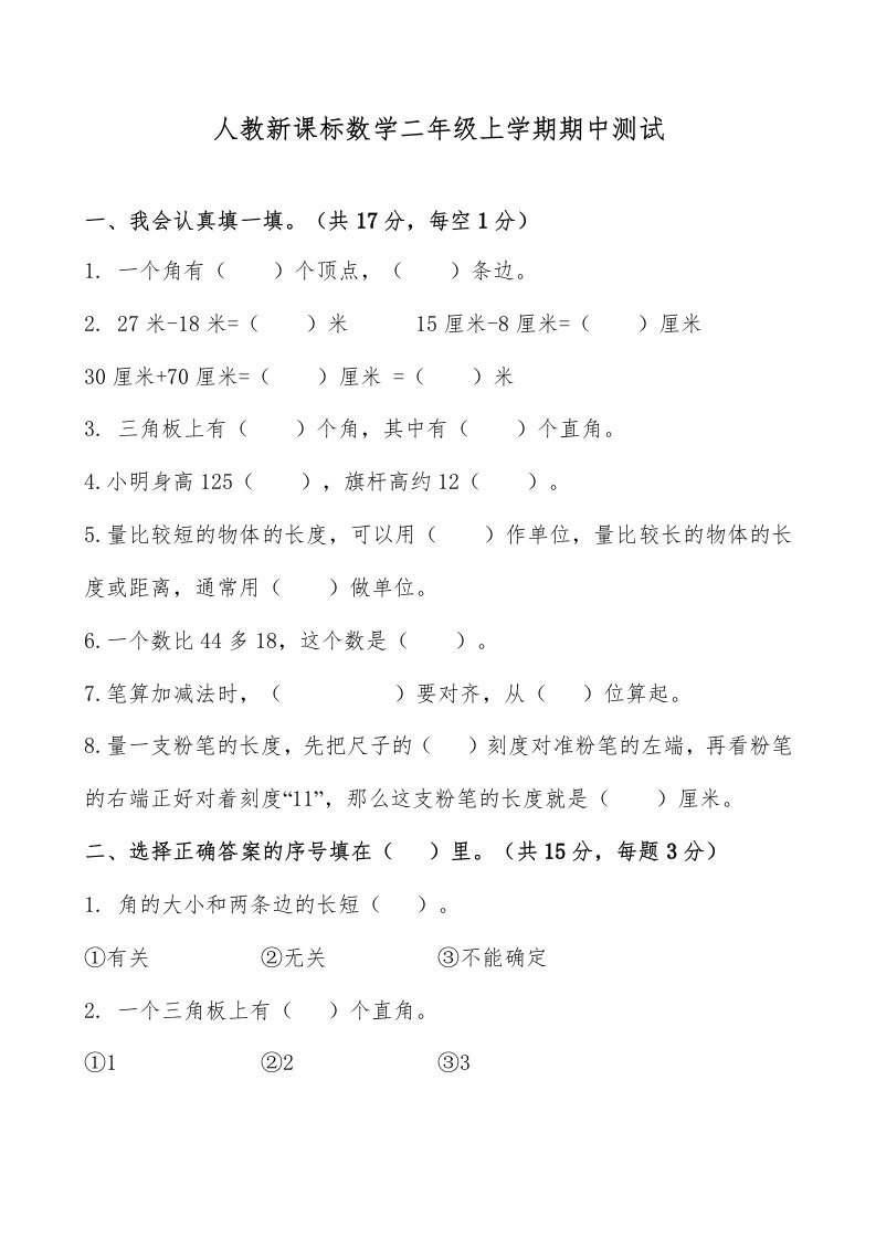 二年级数学上册期中测试卷1(人教版)_共6页