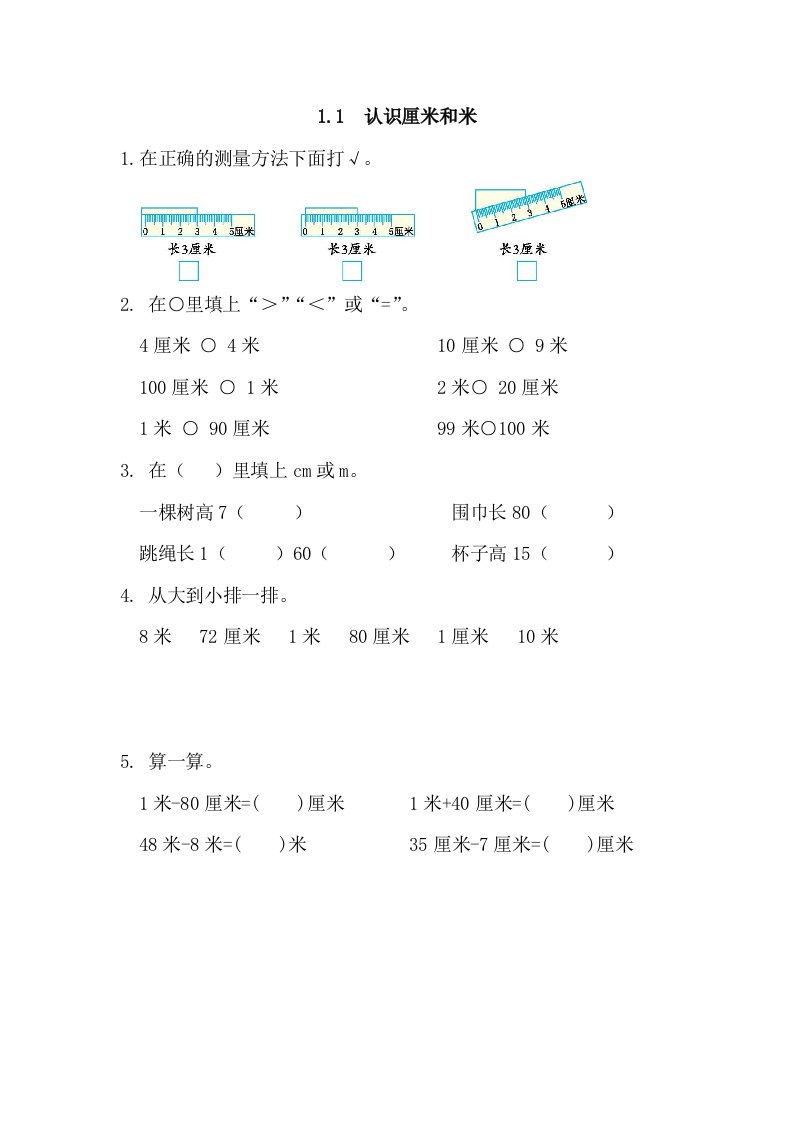 二年级数学上册1.1认识厘米和米(人教版)_共2页