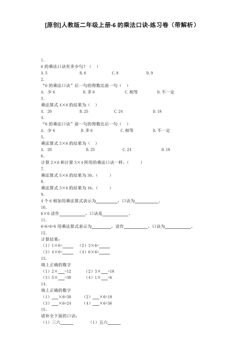 当前位置: 首页小学资源小学二年级正文 二年级数学上册同步练习-6的乘法口诀-秋(人教版)_共6页 小学二年级 2 周前 0 0 5 以上为部分内容预览,如需源文档请登录您的会员账号进行下载! 声明:本站所有文章,如无特殊说明或标注,均为本站原创发布。任何个人或组织,在未征得本站同意时,禁止复制、盗用、采集、发布本站内容到任何网站、书籍等各类媒体平台。如若本站内容侵犯了原著者的合法权益,可联系我们进行处理。 尚学资源永久会员 打赏 收藏 海报 链接