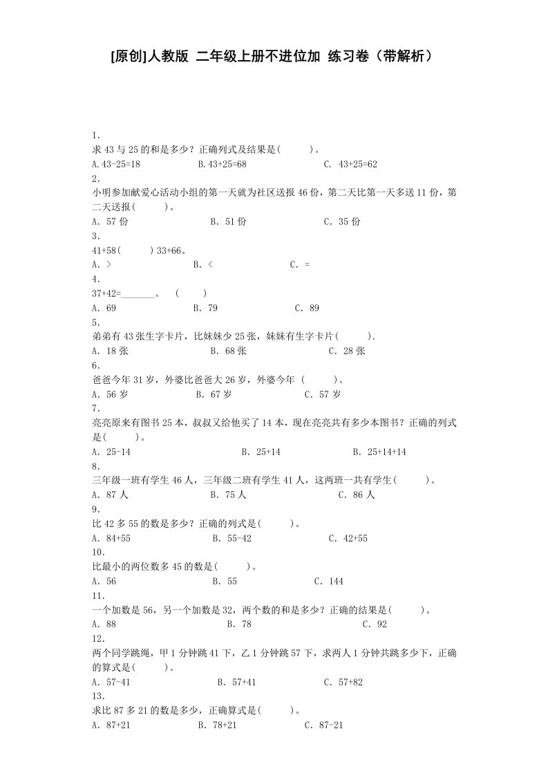 当前位置: 首页小学资源小学二年级正文 二年级数学上册同步练习-不进位加-秋(人教版)_共6页 小学二年级 2 周前 0 0 5 以上为部分内容预览,如需源文档请登录您的会员账号进行下载! 声明:本站所有文章,如无特殊说明或标注,均为本站原创发布。任何个人或组织,在未征得本站同意时,禁止复制、盗用、采集、发布本站内容到任何网站、书籍等各类媒体平台。如若本站内容侵犯了原著者的合法权益,可联系我们进行处理。 尚学资源永久会员 打赏 收藏 海报 链接