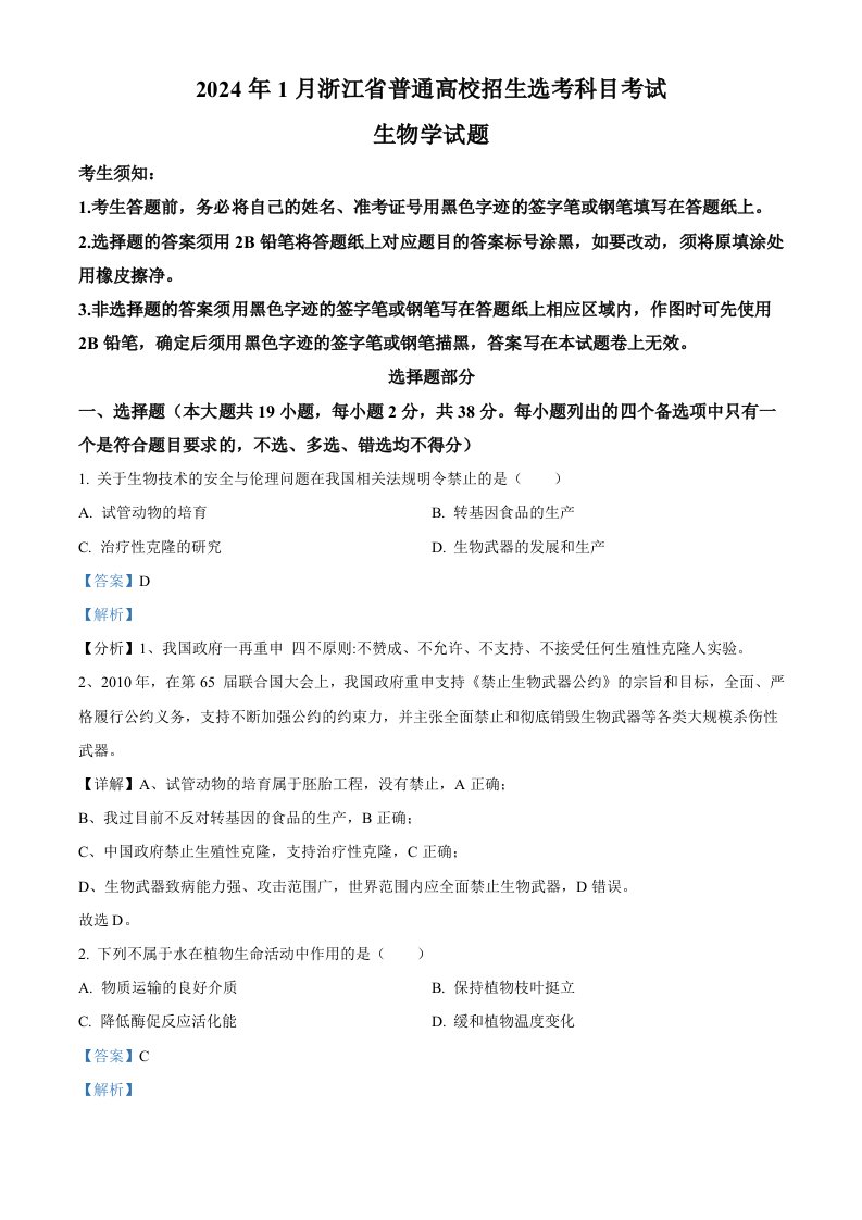 2024年高考生物试卷(浙江)(1月)(含答案)_共22页