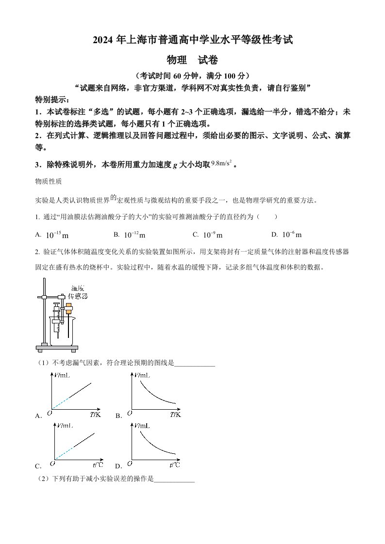 当前位置: 首页高中资源高考真题正文 2024年高考物理试卷(上海)(回忆版)(空白卷)_共6页 高考真题 2 周前 0 0 5 以上为部分内容预览,如需源文档请登录您的会员账号进行下载! 声明:本站所有文章,如无特殊说明或标注,均为本站原创发布。任何个人或组织,在未征得本站同意时,禁止复制、盗用、采集、发布本站内容到任何网站、书籍等各类媒体平台。如若本站内容侵犯了原著者的合法权益,可联系我们进行处理。 尚学资源永久会员 打赏 收藏 海报 链接