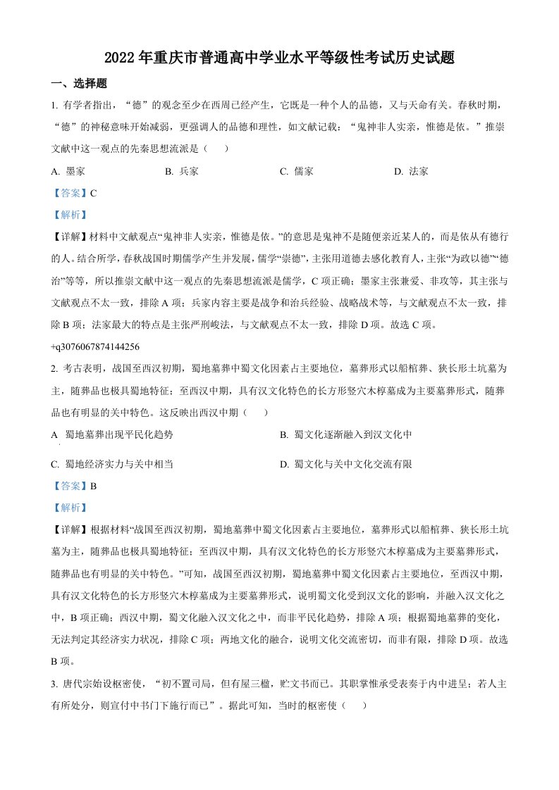 2022年高考历史试卷(重庆)(含答案)_共13页