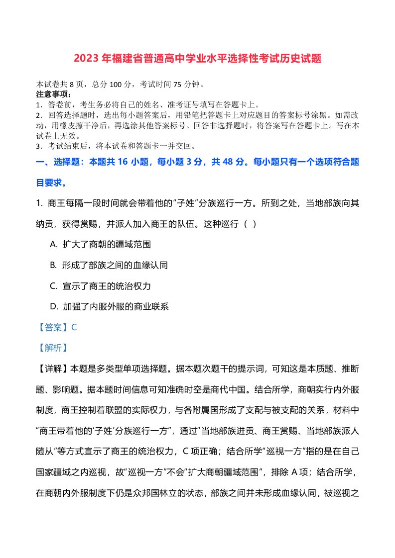 2023年高考历史试卷(福建)(含答案)_共25页