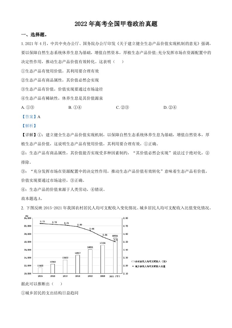 2022年高考政治试卷(全国甲卷)(含答案)_共15页