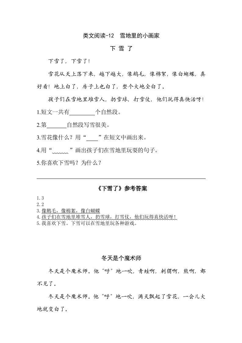 当前位置: 首页小学资源小学一年级正文 一年级语文上册类文阅读-12雪地里的小画家(部编版)_共2页 小学一年级 2 周前 0 0 5 以上为部分内容预览,如需源文档请登录您的会员账号进行下载! 声明:本站所有文章,如无特殊说明或标注,均为本站原创发布。任何个人或组织,在未征得本站同意时,禁止复制、盗用、采集、发布本站内容到任何网站、书籍等各类媒体平台。如若本站内容侵犯了原著者的合法权益,可联系我们进行处理。 尚学资源永久会员 打赏 收藏 海报 链接
