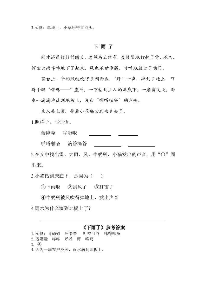 当前位置: 首页小学资源小学一年级正文 一年级语文上册类文阅读-8雨点儿(部编版)_共2页 小学一年级 2 周前 0 0 5 以上为部分内容预览,如需源文档请登录您的会员账号进行下载! 声明:本站所有文章,如无特殊说明或标注,均为本站原创发布。任何个人或组织,在未征得本站同意时,禁止复制、盗用、采集、发布本站内容到任何网站、书籍等各类媒体平台。如若本站内容侵犯了原著者的合法权益,可联系我们进行处理。 尚学资源永久会员 打赏 收藏 海报 链接