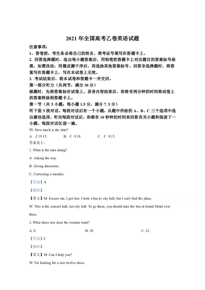 2021年高考英语试卷(全国乙卷)(含答案)_共29页