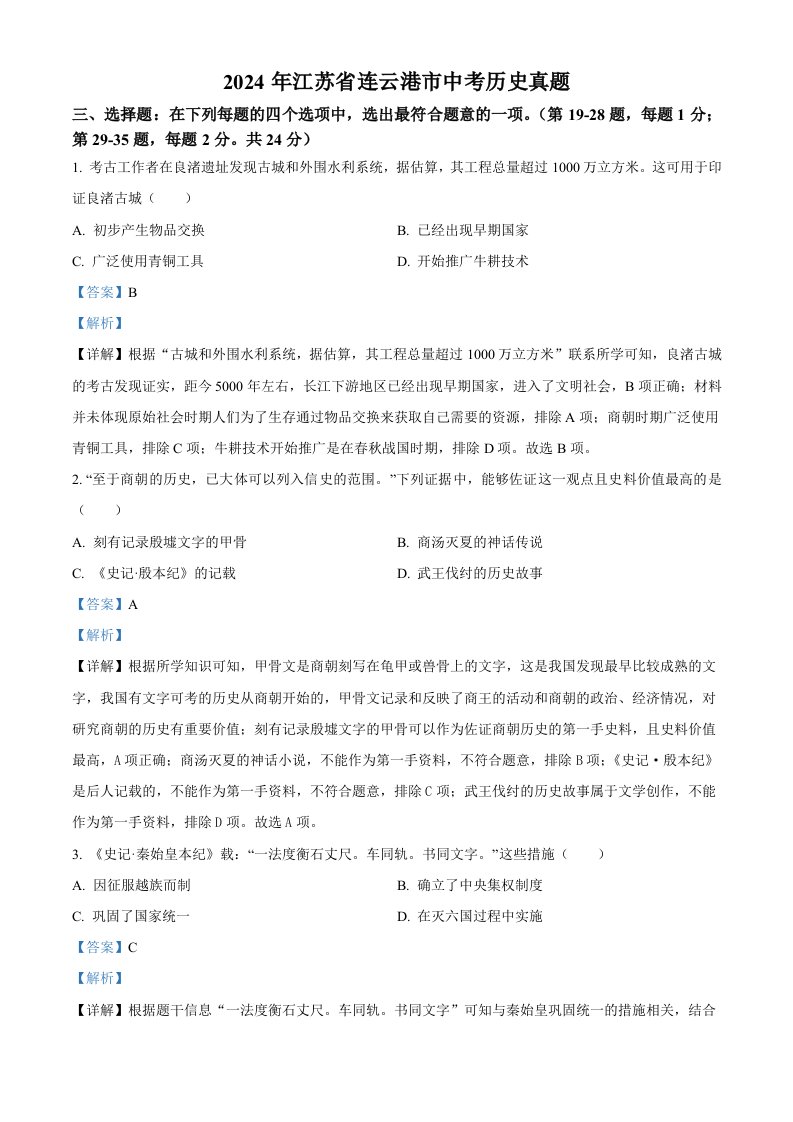 2024年江苏省连云港市中考历史真题(含答案)_共12页