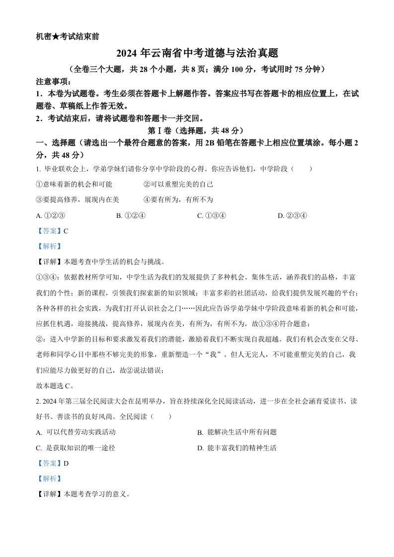 2024年云南省中考道德与法治真题(含答案)_共22页