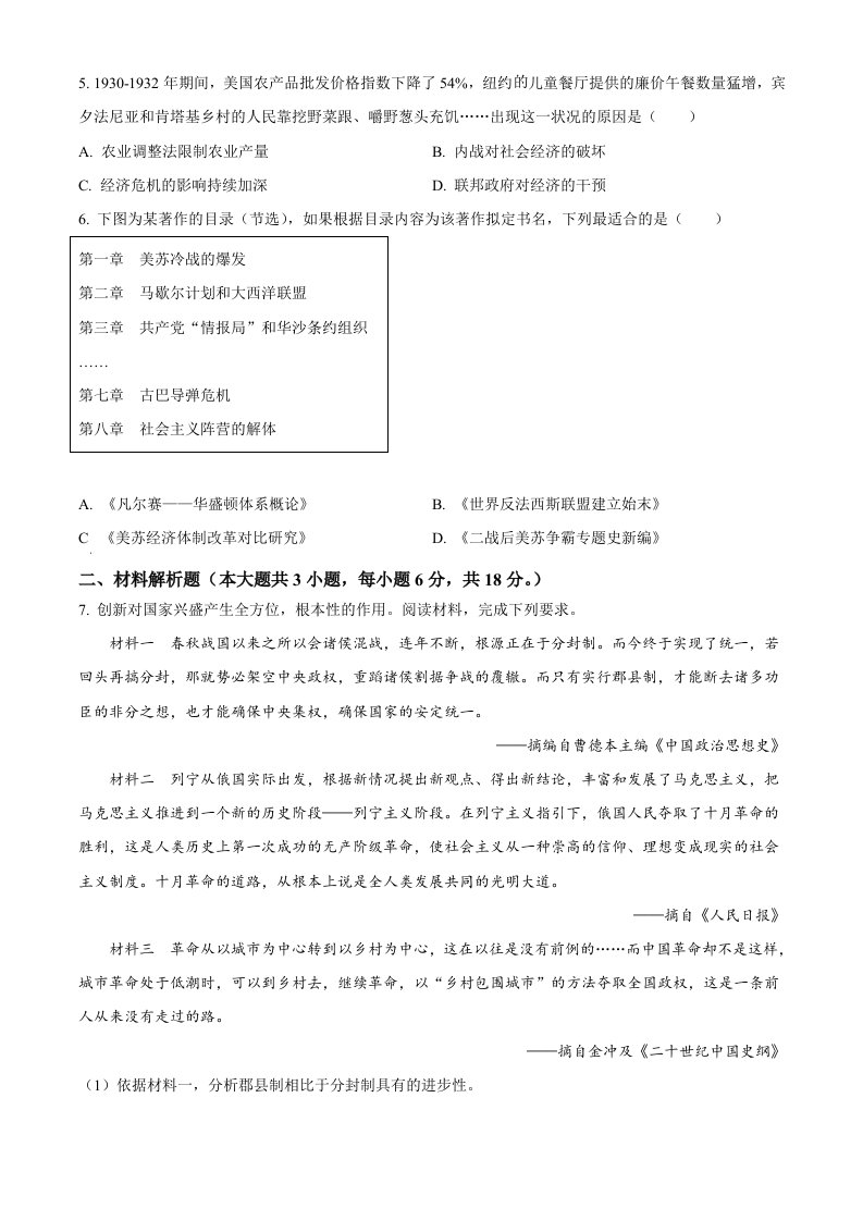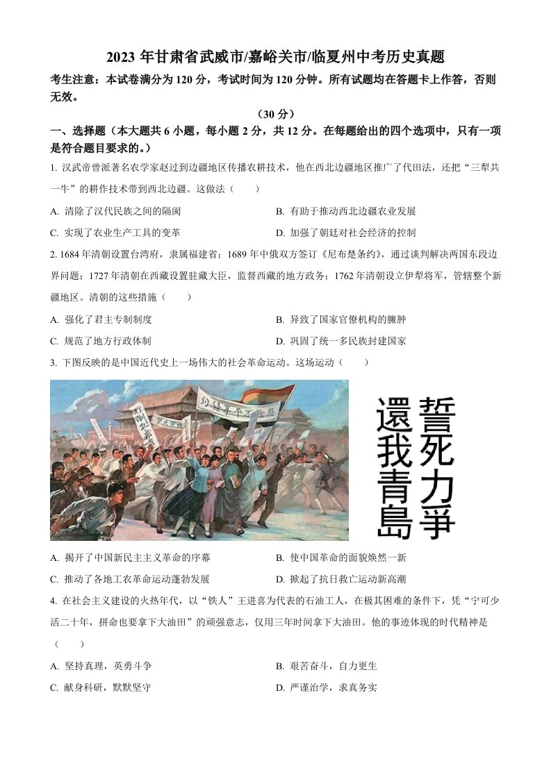 2024年甘肃省临夏州中考历史真题(空白卷)_共5页