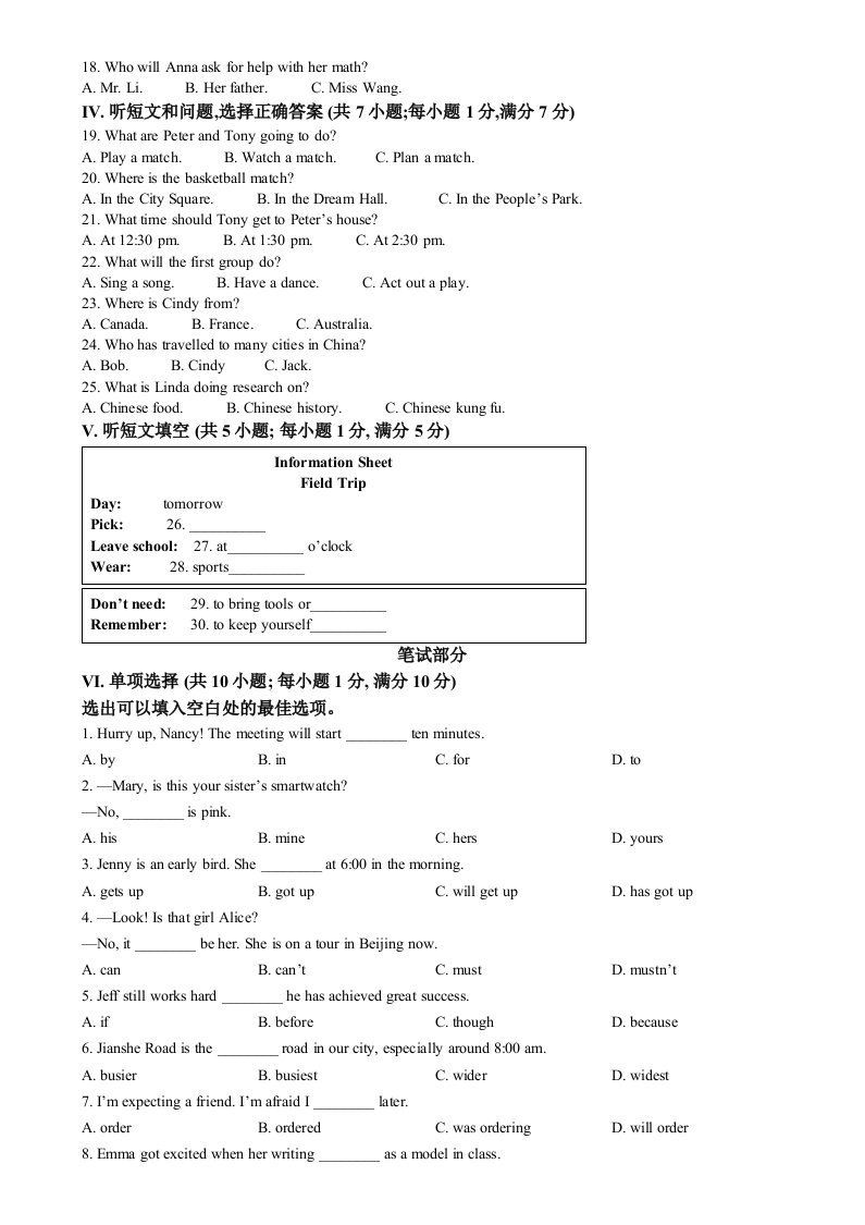当前位置: 首页初中资源中考真题正文 2024年河北省中考英语真题(空白卷)_共8页 中考真题 2 周前 0 0 5 以上为部分内容预览,如需源文档请登录您的会员账号进行下载! 声明:本站所有文章,如无特殊说明或标注,均为本站原创发布。任何个人或组织,在未征得本站同意时,禁止复制、盗用、采集、发布本站内容到任何网站、书籍等各类媒体平台。如若本站内容侵犯了原著者的合法权益,可联系我们进行处理。 尚学资源永久会员 打赏 收藏 海报 链接