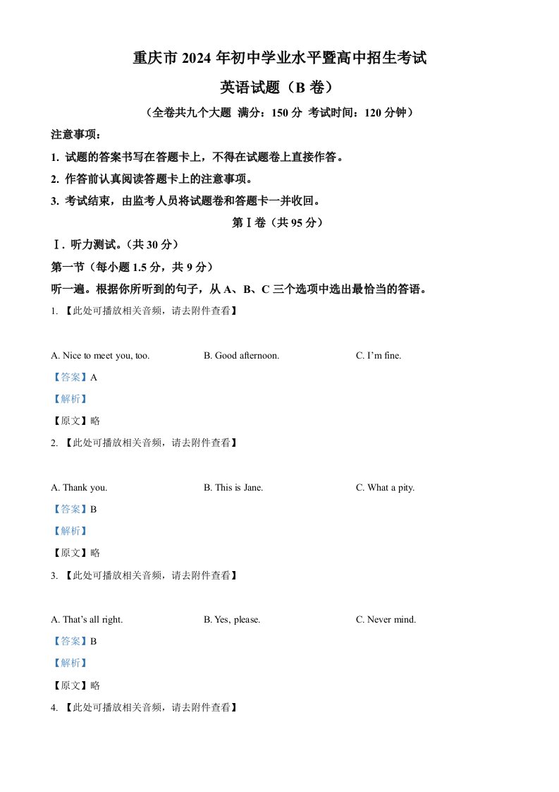当前位置: 首页初中资源中考真题正文 2024年重庆市中考英语真题(B卷)(含答案)_共24页 中考真题 2 周前 0 0 15 以上为部分内容预览,如需源文档请登录您的会员账号进行下载! 声明:本站所有文章,如无特殊说明或标注,均为本站原创发布。任何个人或组织,在未征得本站同意时,禁止复制、盗用、采集、发布本站内容到任何网站、书籍等各类媒体平台。如若本站内容侵犯了原著者的合法权益,可联系我们进行处理。 尚学资源永久会员 打赏 收藏 海报 链接