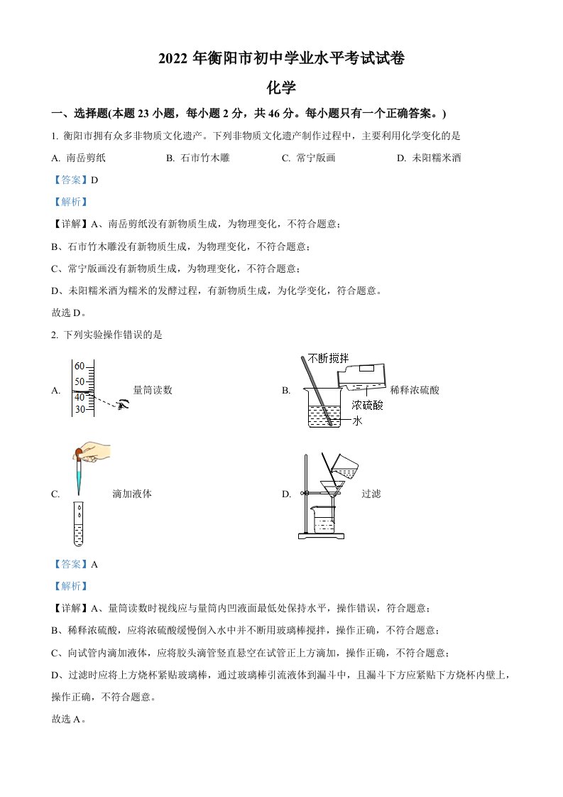 2022年湖南省衡阳市中考化学真题(含答案)_共24页