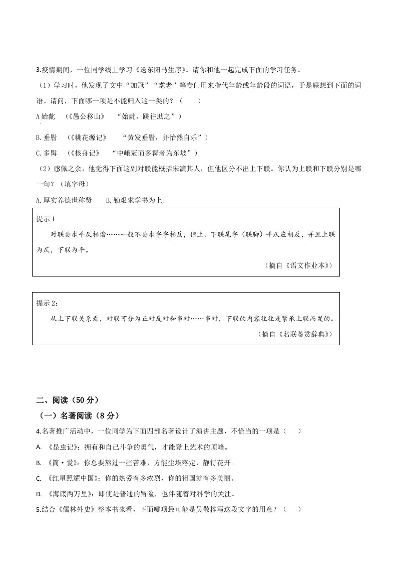 当前位置: 首页初中资源中考真题正文 浙江省湖州市2020年中考语文试题(空白卷)_共10页 中考真题 2 周前 0 0 5 以上为部分内容预览,如需源文档请登录您的会员账号进行下载! 声明:本站所有文章,如无特殊说明或标注,均为本站原创发布。任何个人或组织,在未征得本站同意时,禁止复制、盗用、采集、发布本站内容到任何网站、书籍等各类媒体平台。如若本站内容侵犯了原著者的合法权益,可联系我们进行处理。 尚学资源永久会员 打赏 收藏 海报 链接