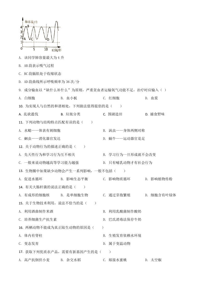 湖南岳阳市2020年中考生物试题(空白卷)_共7页