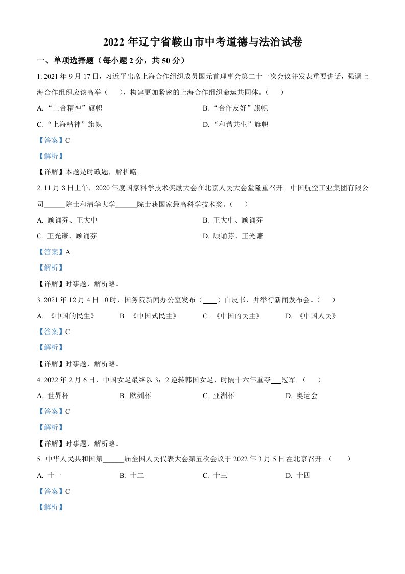 2022年辽宁省鞍山市中考道德与法治真题(含答案)_共15页