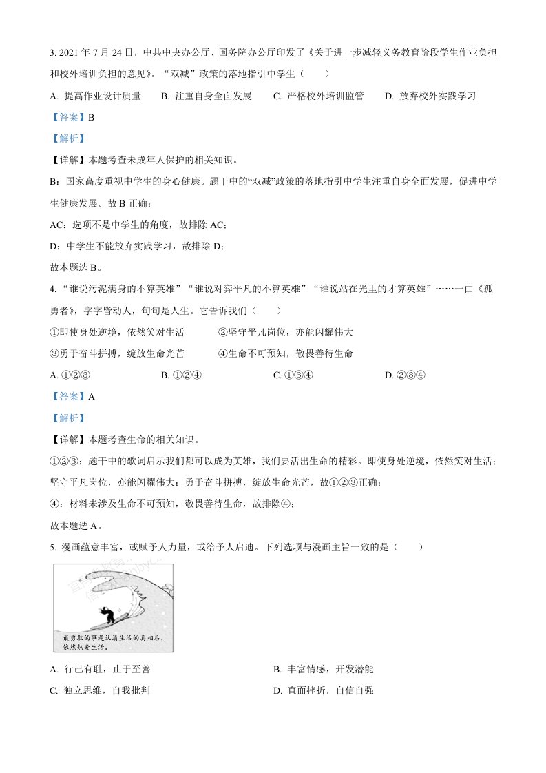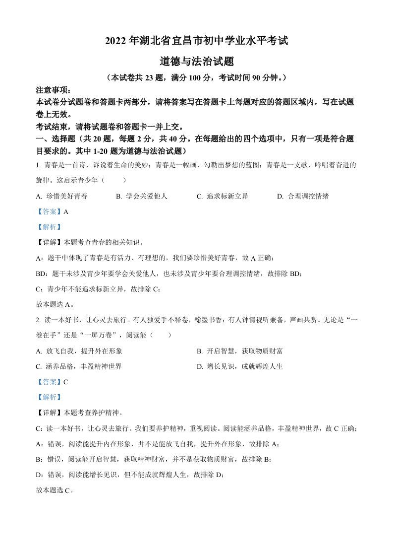 2022年湖北省宜昌市中考道德与法治真题(含答案)_共13页