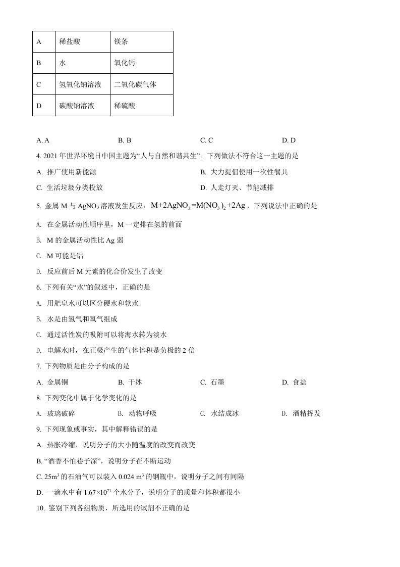 当前位置: 首页初中资源中考真题正文 2022年江苏省南通市中考化学真题(空白卷)_共7页 中考真题 2 周前 0 0 5 以上为部分内容预览,如需源文档请登录您的会员账号进行下载! 声明:本站所有文章,如无特殊说明或标注,均为本站原创发布。任何个人或组织,在未征得本站同意时,禁止复制、盗用、采集、发布本站内容到任何网站、书籍等各类媒体平台。如若本站内容侵犯了原著者的合法权益,可联系我们进行处理。 尚学资源永久会员 打赏 收藏 海报 链接