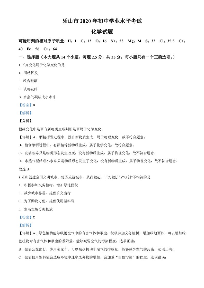 四川省乐山市2020年中考化学试题(含答案)_共16页