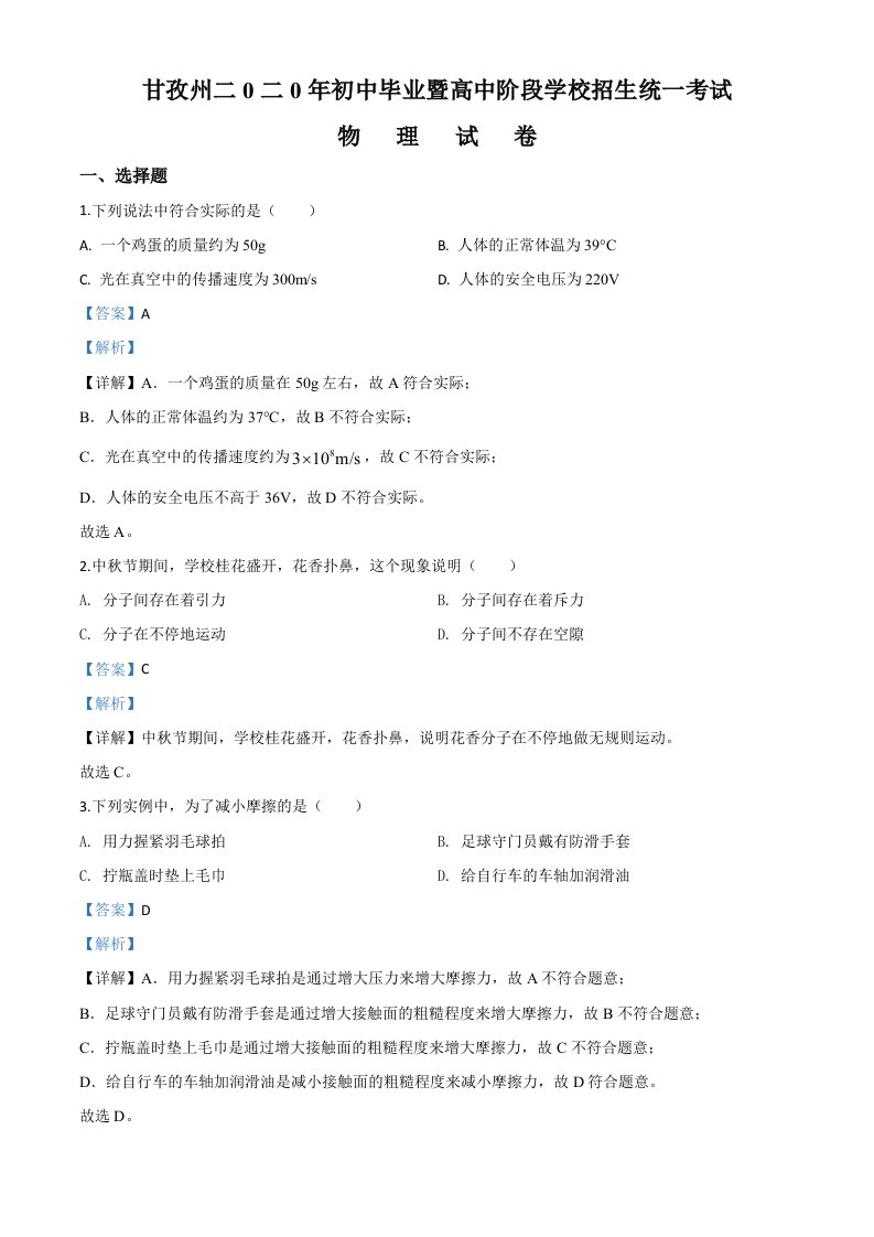 2020年四川省甘孜州中考物理试题(初中毕业暨高中阶段学校招生统一考试物理题)(含答案)_共17页