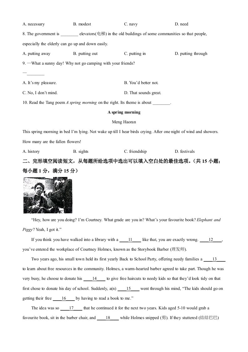当前位置: 首页初中资源中考真题正文 2022年江苏省泰州市中考英语真题(空白卷)_共15页 中考真题 2 周前 0 0 10 以上为部分内容预览,如需源文档请登录您的会员账号进行下载! 声明:本站所有文章,如无特殊说明或标注,均为本站原创发布。任何个人或组织,在未征得本站同意时,禁止复制、盗用、采集、发布本站内容到任何网站、书籍等各类媒体平台。如若本站内容侵犯了原著者的合法权益,可联系我们进行处理。 尚学资源永久会员 打赏 收藏 海报 链接