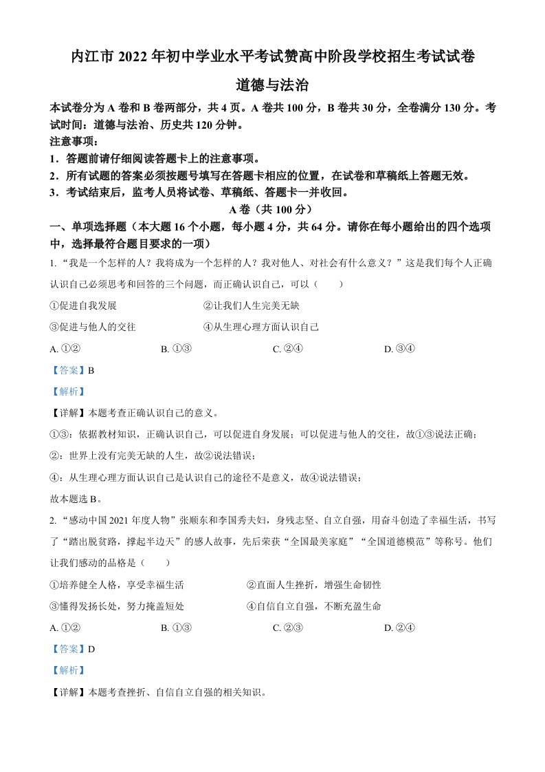2022年四川省内江市中考道德与法治真题(含答案)_共14页