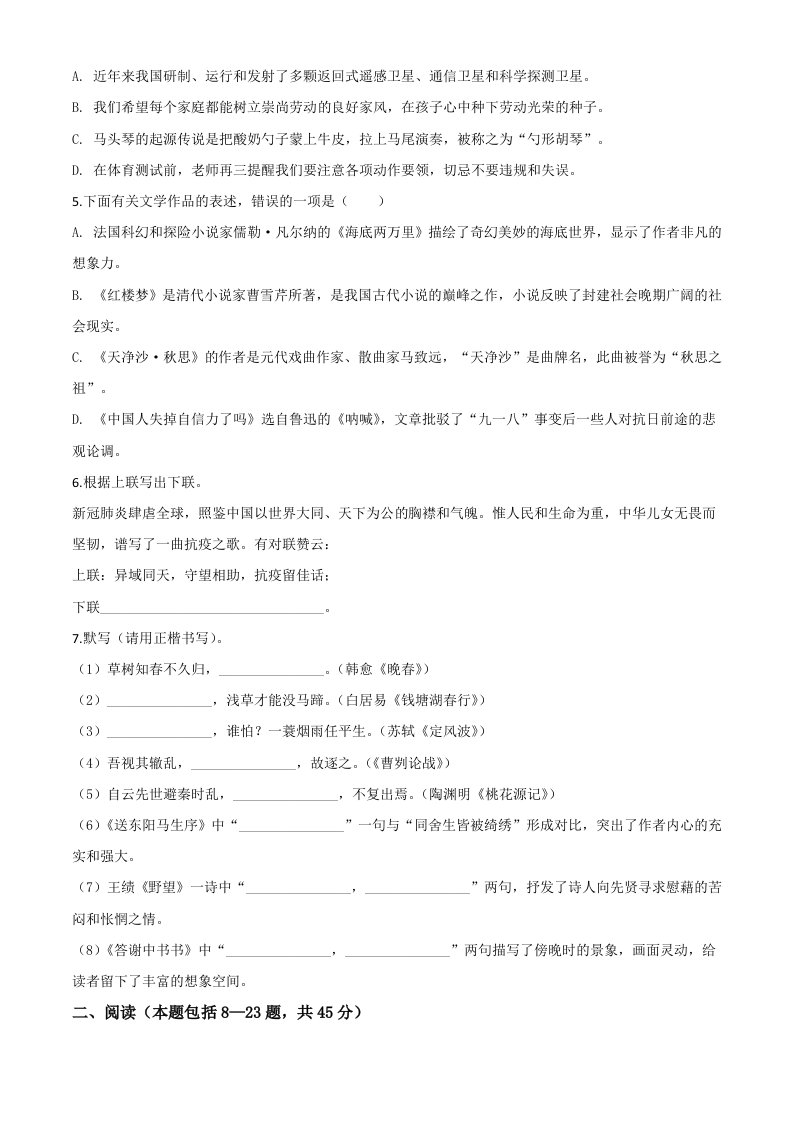 内蒙古包头市2020年中考语文试题(空白卷)_共8页