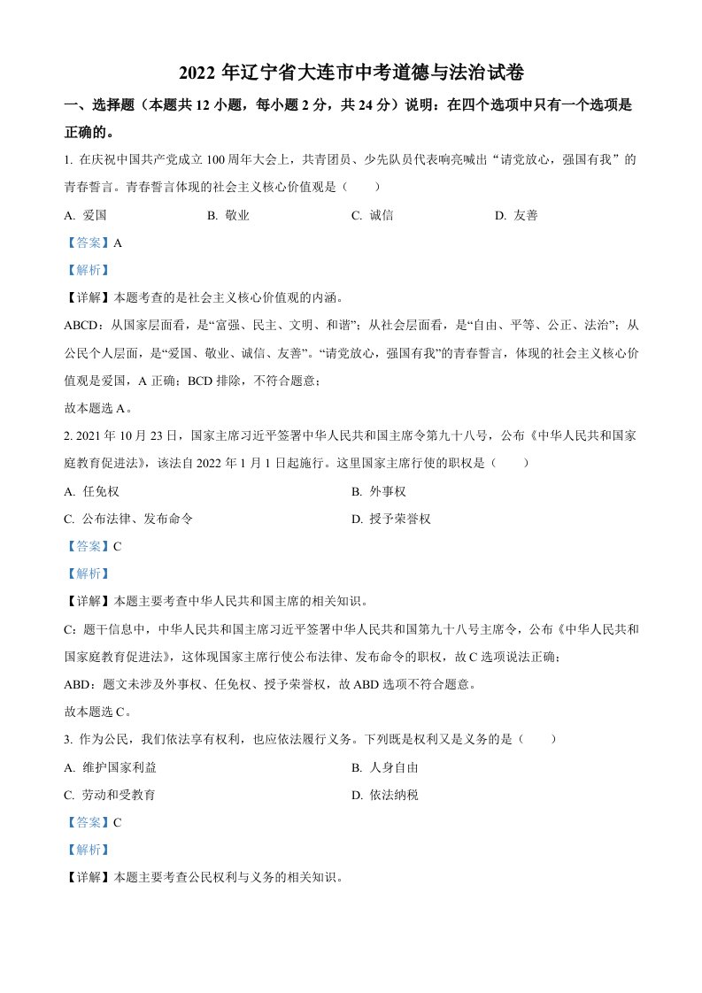 2022年辽宁省大连市中考道德与法治真题(含答案)_共10页