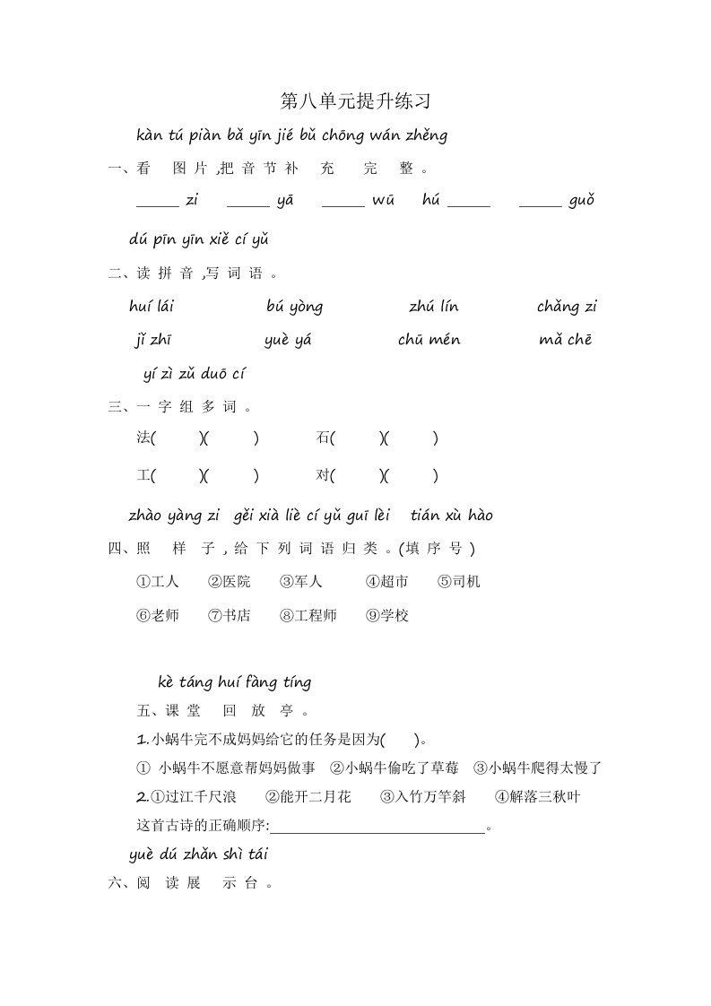 一年级语文上册第8单元提升练习(部编版)_共5页