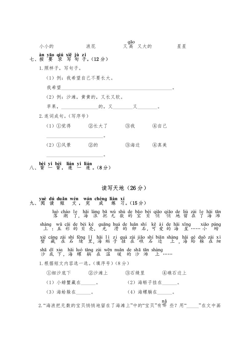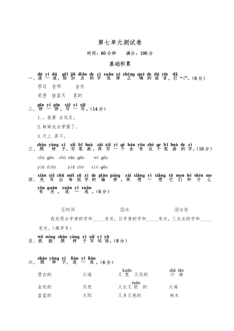 一年级语文上册第7单元测试卷2(部编版)_共5页