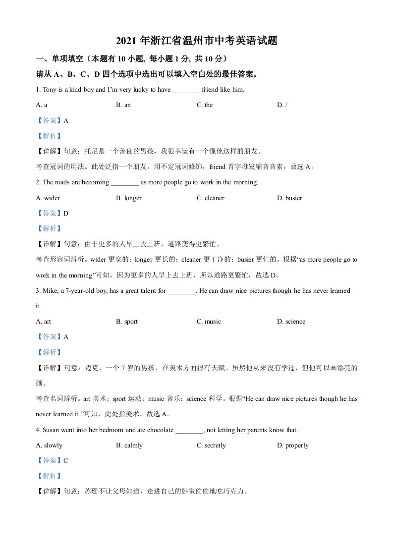 当前位置: 首页初中资源中考真题正文 浙江省温州市2021年中考英语试题(含答案)_共19页 中考真题 2 周前 0 0 10 以上为部分内容预览,如需源文档请登录您的会员账号进行下载! 声明:本站所有文章,如无特殊说明或标注,均为本站原创发布。任何个人或组织,在未征得本站同意时,禁止复制、盗用、采集、发布本站内容到任何网站、书籍等各类媒体平台。如若本站内容侵犯了原著者的合法权益,可联系我们进行处理。 尚学资源永久会员 打赏 收藏 海报 链接