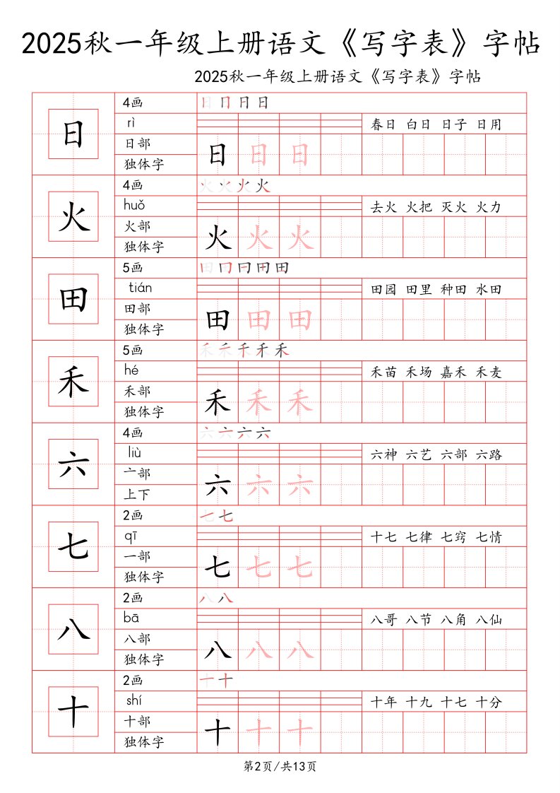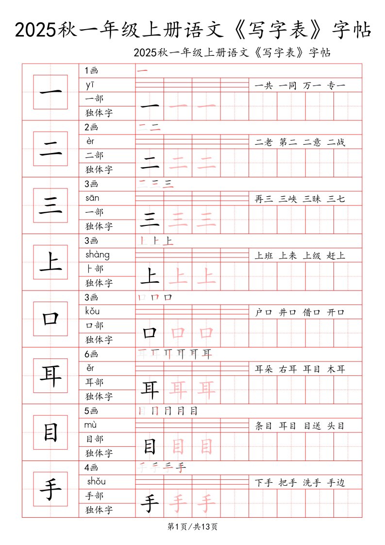 当前位置: 首页小学资源小学一年级正文 一上语文【2025秋一《写字表》一类字字帖】_共13页 小学一年级 2 周前 0 0 10 以上为部分内容预览,如需源文档请登录您的会员账号进行下载! 声明:本站所有文章,如无特殊说明或标注,均为本站原创发布。任何个人或组织,在未征得本站同意时,禁止复制、盗用、采集、发布本站内容到任何网站、书籍等各类媒体平台。如若本站内容侵犯了原著者的合法权益,可联系我们进行处理。 尚学资源永久会员 打赏 收藏 海报 链接