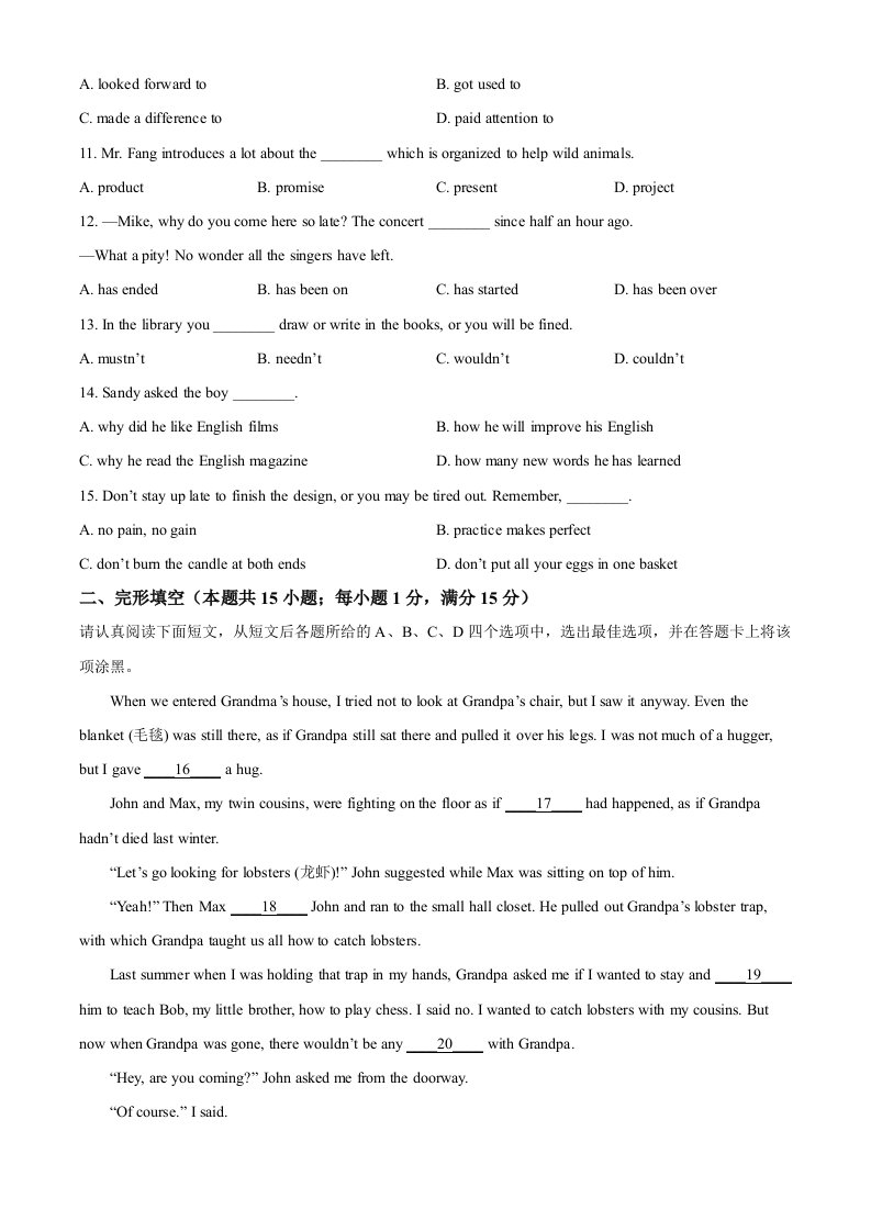 当前位置: 首页初中资源中考真题正文 2022年江苏省南通市中考英语真题(空白卷)_共14页 中考真题 2 周前 0 0 10 以上为部分内容预览,如需源文档请登录您的会员账号进行下载! 声明:本站所有文章,如无特殊说明或标注,均为本站原创发布。任何个人或组织,在未征得本站同意时,禁止复制、盗用、采集、发布本站内容到任何网站、书籍等各类媒体平台。如若本站内容侵犯了原著者的合法权益,可联系我们进行处理。 尚学资源永久会员 打赏 收藏 海报 链接